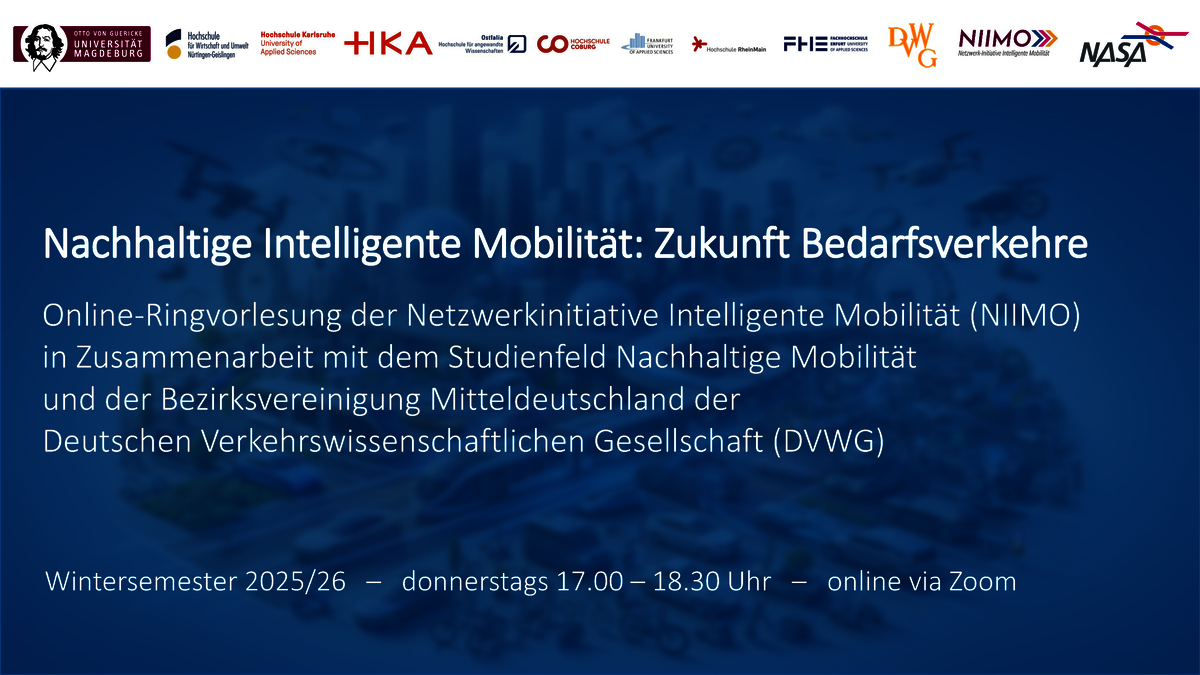Die Ringvorlesung als Hochschul-übergreifendes Lehrmodul dient dem aktuellen Erfahrungsaustausch im Bereich der nachhaltigen, intelligenten Mobilität zwischen Praktikern, Wissenschaftlern und Studierenden im Bereich Verkehr, Mobilität und Wirtschaftsingenieurwesen. Die Ringvorlesung ist eine Initiative der Netzwerkinitiative Intelligente Mobilität (NIIMO) in Zusammenarbeit mit dem Studienfeld Nachhaltige Mobilität und der Bezirksvereinigung Mitteldeutschland der Deutschen Verkehrswissenschaftlchen Gesellschaft (DVWG). Die Netzwerkinitiative Intelligente Mobilität (NIIMO) ist eine Kooperation der Nahverkehrsservice Sachsen-Anhalt GmbH (NASA) und der Otto-von-Guericke-Universität Magdeburg (OVGU).